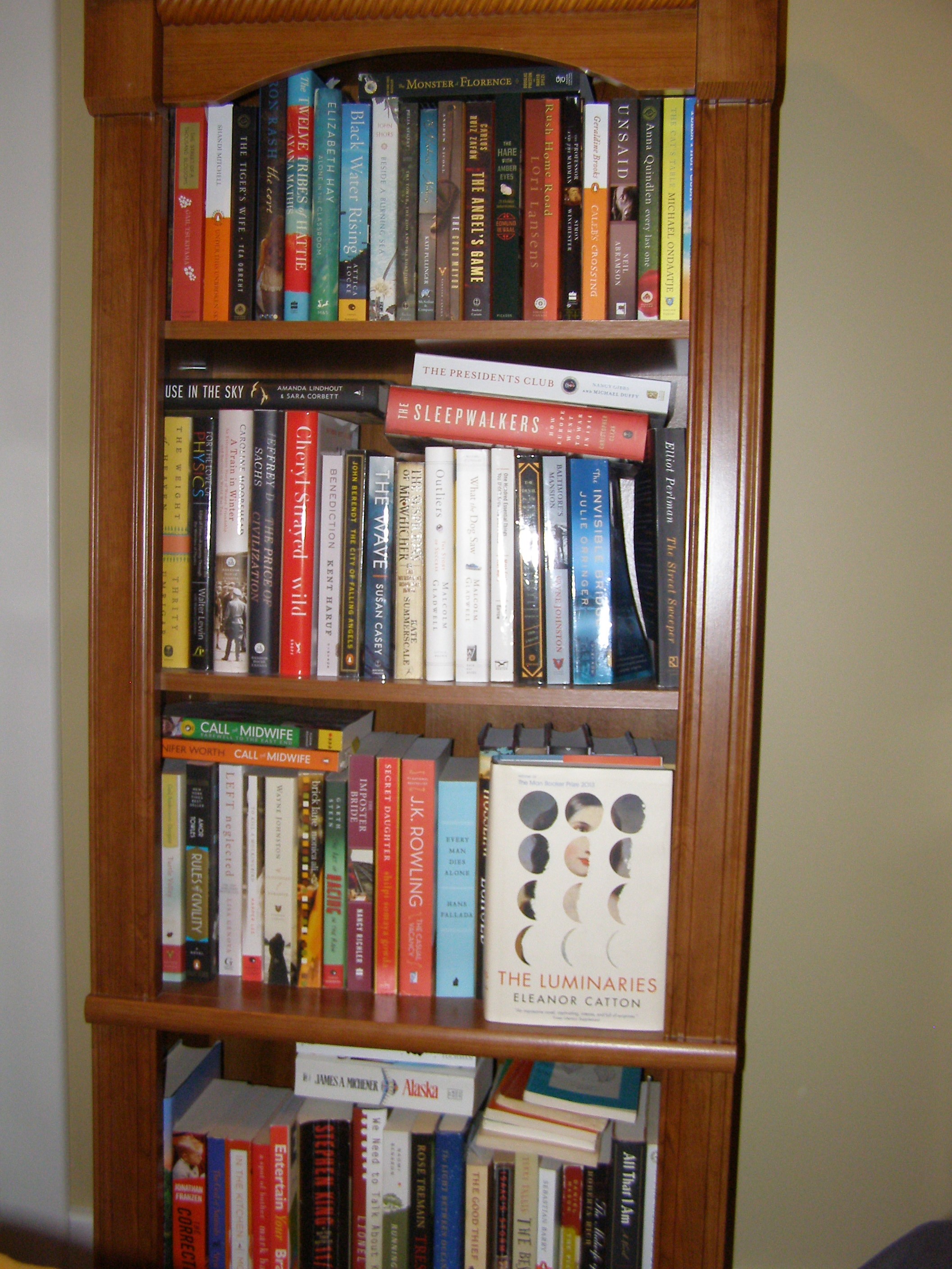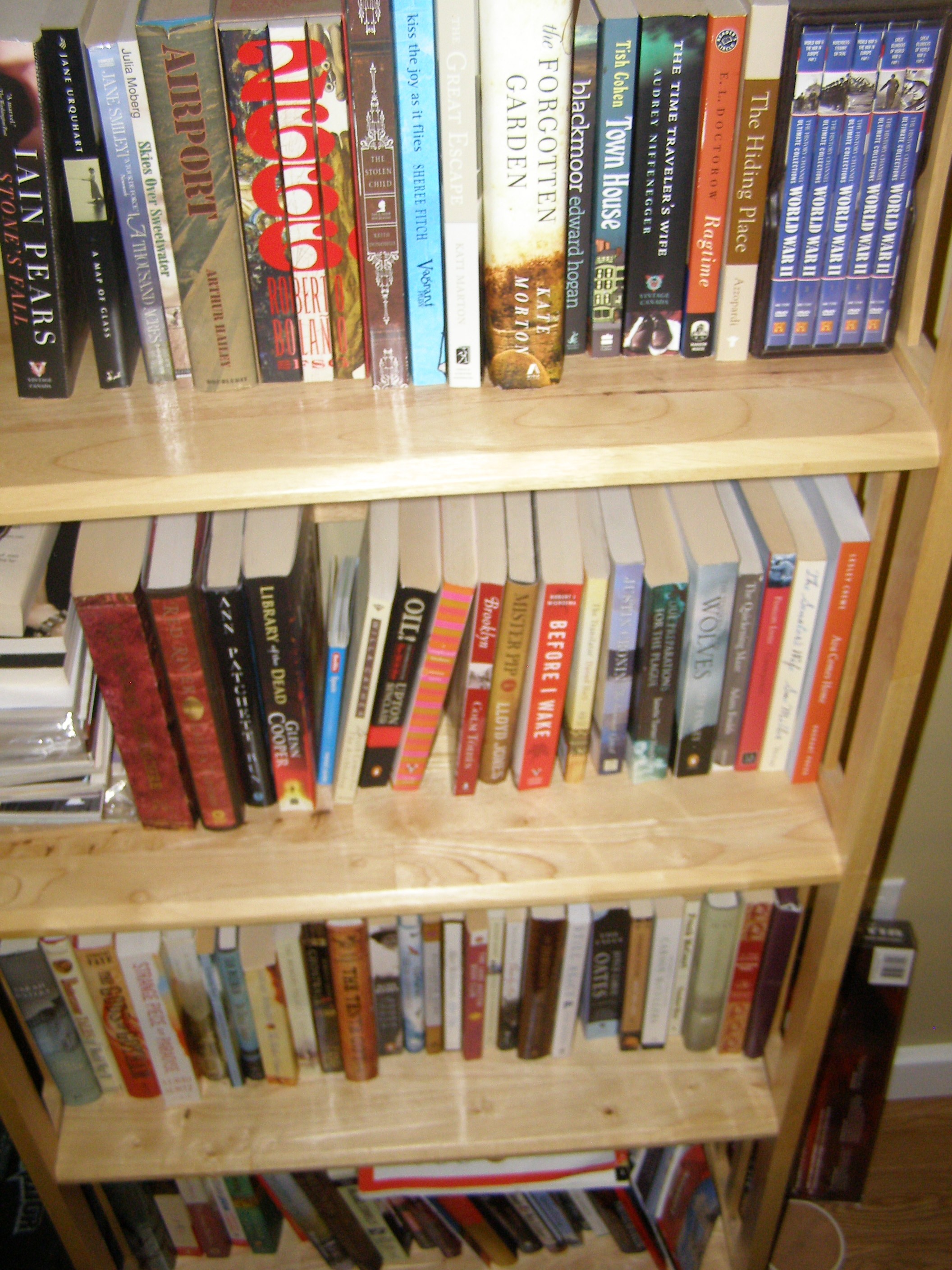 I have been reading books from my Mom’s bookshelves since I was in Junior High.  I’m sure there were some books then that I should not have been reading yet, but I did anyway.  I still borrow from these shelves today.  I love browsing through them, looking at the spines, reading the covers over and over.  It’s so hard to choose just a few, and because her library is always expanding, it never gets any easier, but I wouldn’t want it any other way.