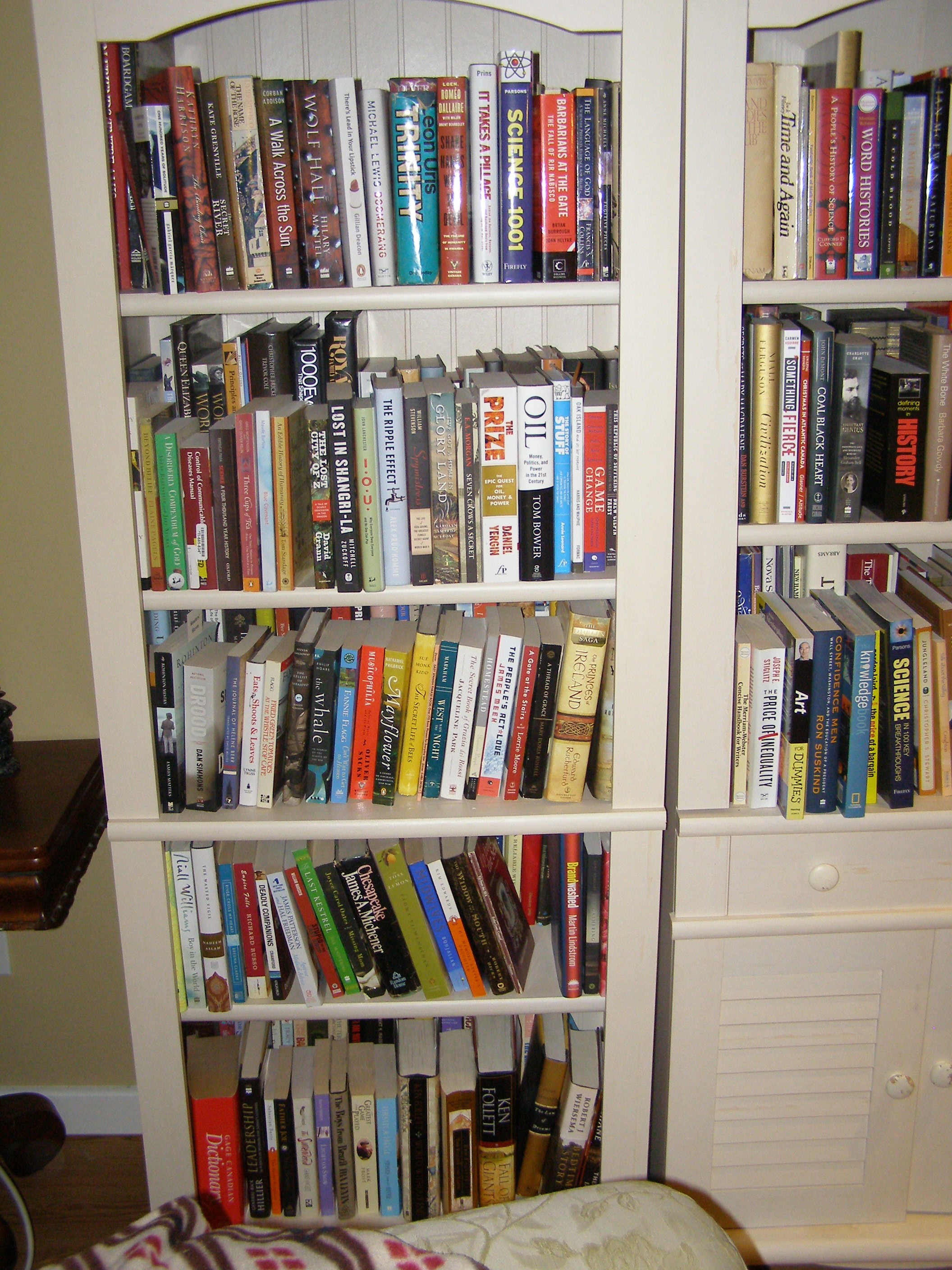 Some of the books on those shelves are my Dad’s. His are more science fiction, or puzzlers like Dan Brown’s books. I remember reading Dune and Contact by Carl Sagan. I tend to prefer my Mom’s books, but when I read one my Dad recommends, I usually really enjoy it. We shared The Passage a couple of years ago, and were both creeped out.