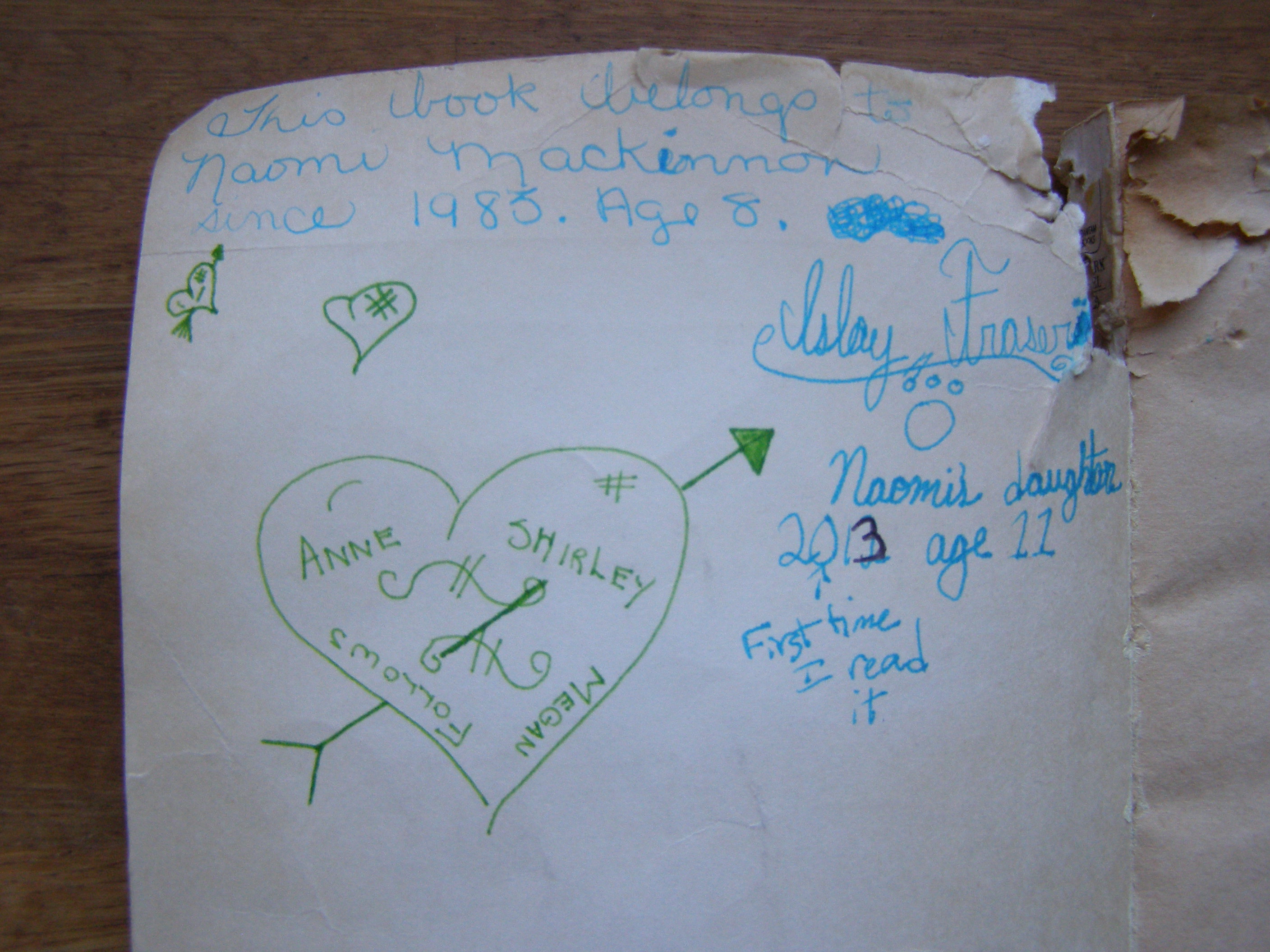 My 8-year-old inscription and artwork, and my 11-year-old daughter’s signature and age, on the inside cover (which was just recently chewed on by the dog):