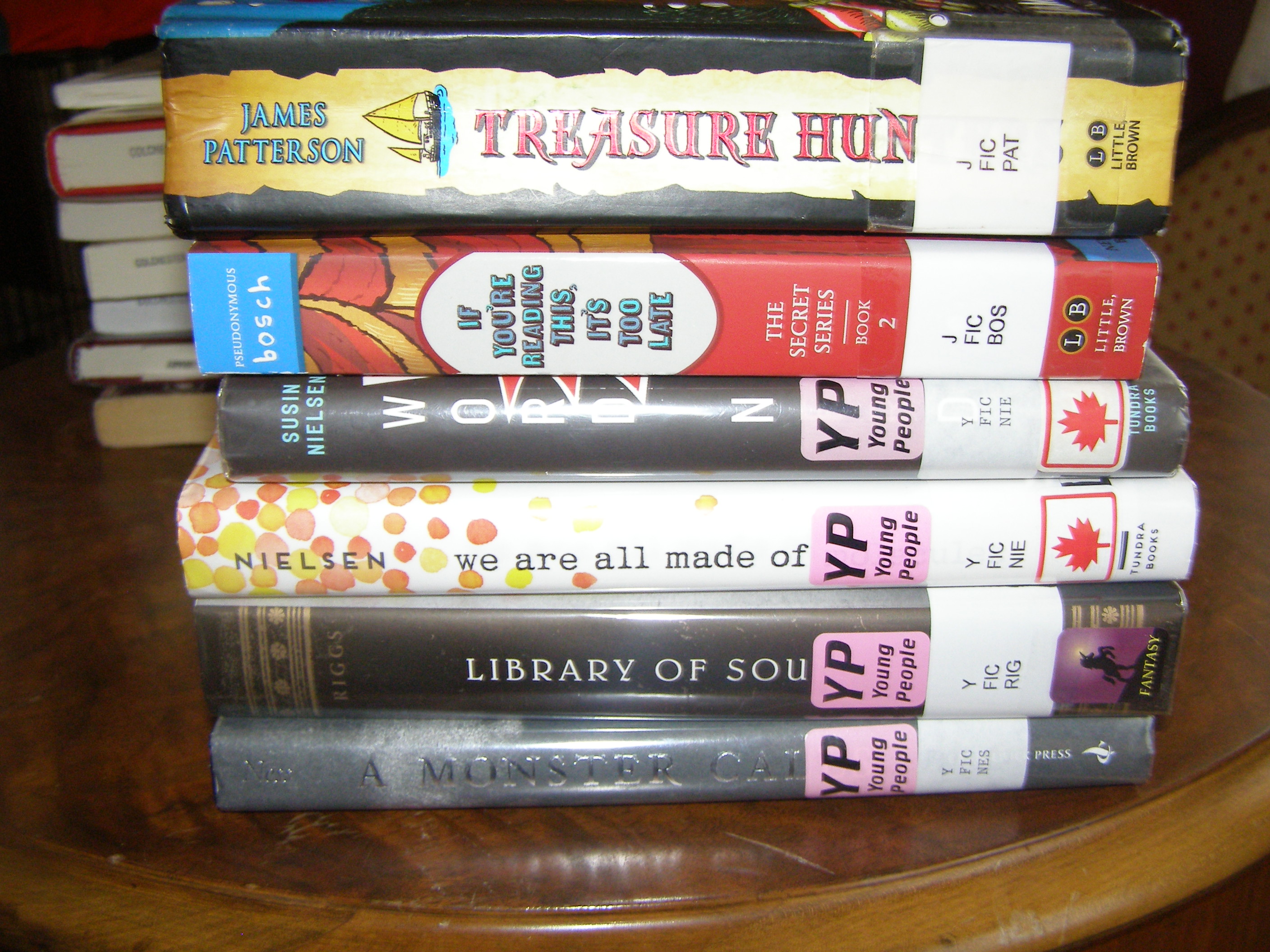 I also picked up a lot of books for the kids, hoping that it would help deter me from going into the adult end of the library. This tactic did work a couple of times, and I will be using it again. Unfortunately, though, there are a couple of books that I got for my daughter that I also want to read while they’re here (We Are All Made of Molecules and A Monster Calls). She also loved Library of Souls. They won’t take long, right?