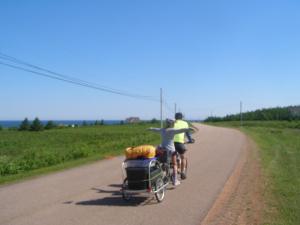 Our loaded down bike trailer hooked up to the tandem.