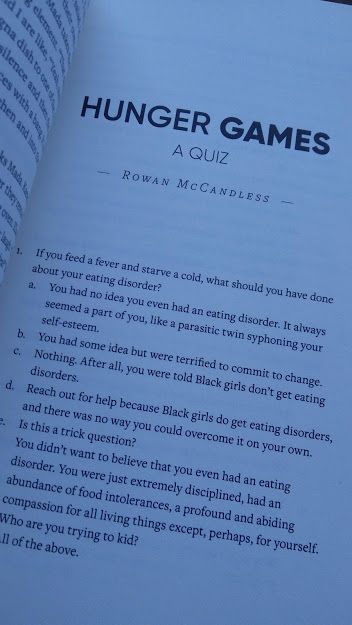 Hunger Games by Rowan McCandless is a powerful story about a Black biracial woman with an eating disorder. The story is structured as a quiz, and each question with its multiple answers to choose from makes you think. Many of the available answers are things I hadn’t thought of or considered before. For example, I had never before considered the fact that having an eating disorder is a different experience for a Black woman than for a white woman. When the narrator sought help in a Group therapy situation, a woman across from her said, “Women of colour have it so much easier. They’re okay with their bodies – with having bigger bodies. They don’t have the same pressure to look a certain way – to be thin. It’s harder for white women, all this pressure to be thin.”