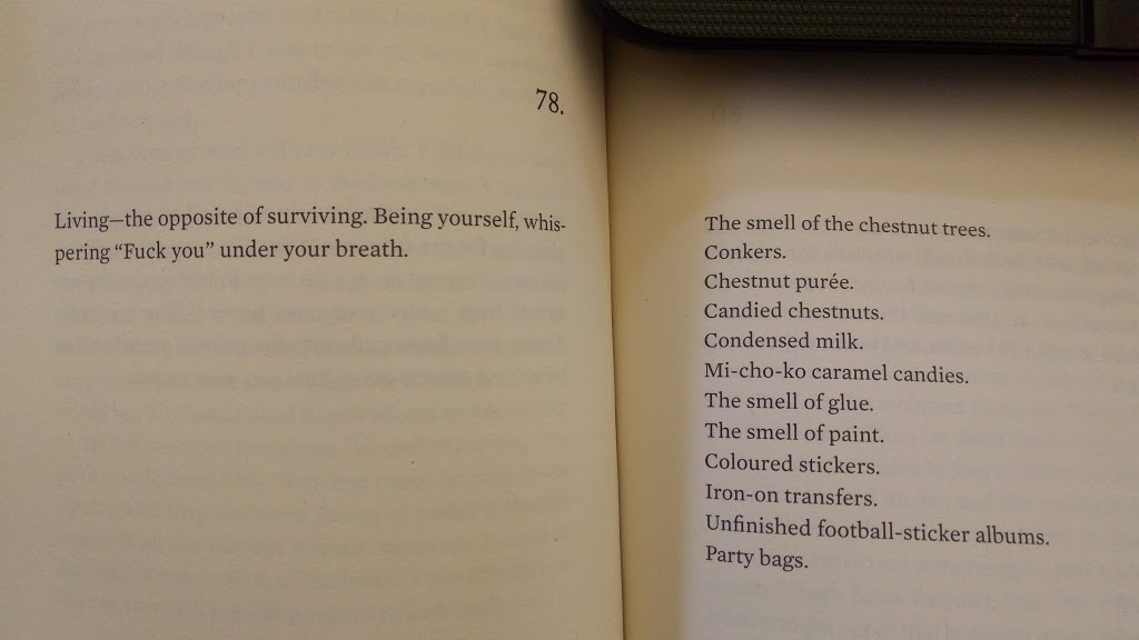 Surviving – not getting overly attached to people, not planning for the future, not dwelling unnecessarily on the past, keeping an eye on your things so they’re not swiped from under your nose, never telling the truth, digging your fingernails into the palm of your hand or biting your tongue every time you want to cry.