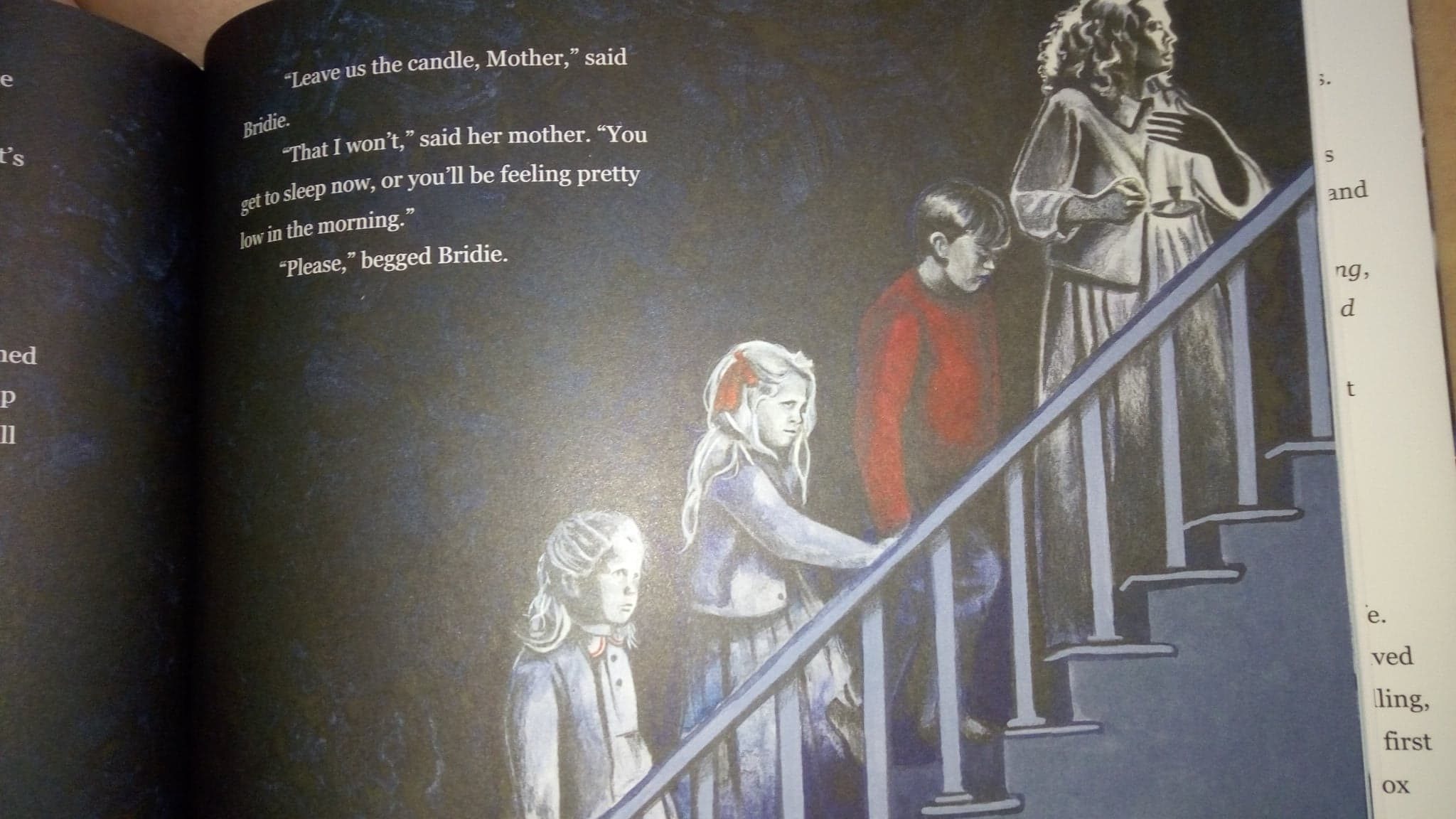 One stormy night, the adults are sitting around telling stories and the kids don’t want to be sent to bed. But after a mysterious bang and some unexplained footsteps, their mother takes them up to bed where they beg to have her leave behind the lit candle.