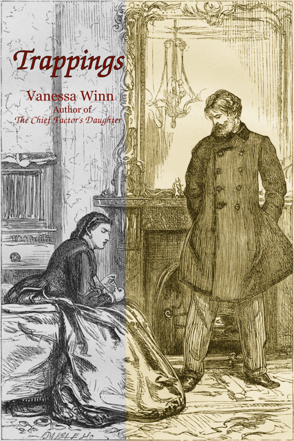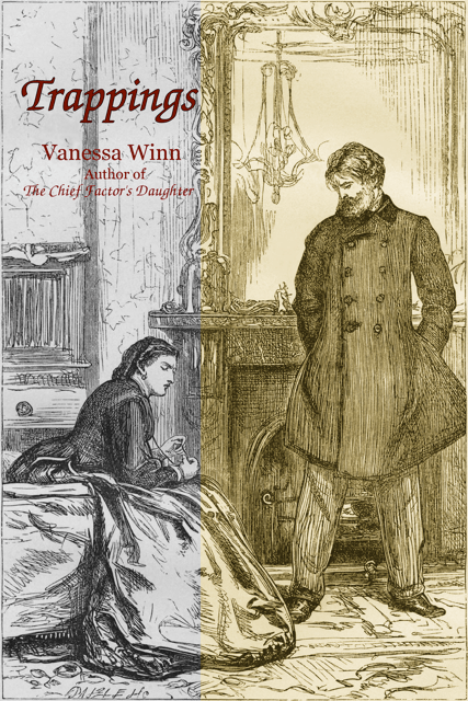 Good question, Bill! I asked Vanessa and here’s what she said: “The cover image is an illustration by John Everett Millais, for one of Anthony Trollope’s novels, The Small House at Allington. It was published in the 1860s — as you know, the era of Trappings. Many novels in the 19th century were illustrated, and I wanted something that reflected the period. The themes of this Trollope novel also suited Trappings. My designer added the sepia / black & white contrast to accentuate the rift between the couple.”